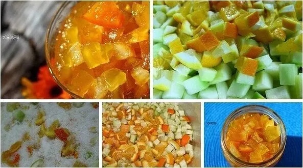 3. Засыпаем сахаром и оставляем минимум на 5 часов либо на ночь (то есть темное время суток), что бы кабачки и цитрусы пустили сок. 4. Ставим таз с кабачками на огнь, доводим до кипения и варим течении нескольких минут.