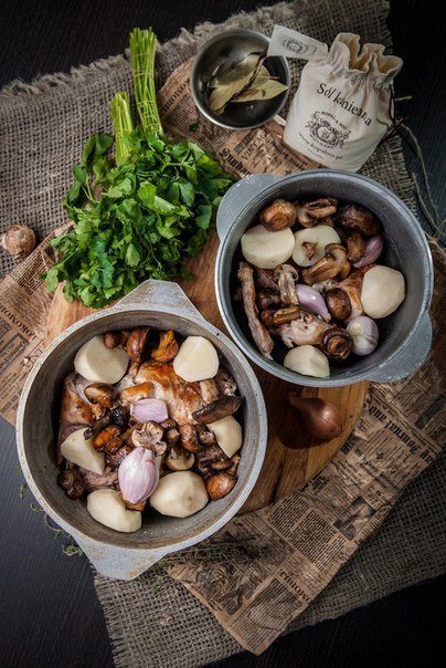 Собрать все вкупе. В казанок сложить слоями мясо, картошку, луковички, все грибы, тимьян,лавровый лист. Все умеренно солить и присыпать перцем.