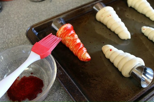 Для вас также пригодится некое количество железных конусов. Итак, поначалу расплостайте свое тесто и соедините все швы совместно. Потом разрезать тесто на 6 равных полос. Раскатать каждую полосу в узкую змейку. Потом оберните каждую змею вокруг конуса.
