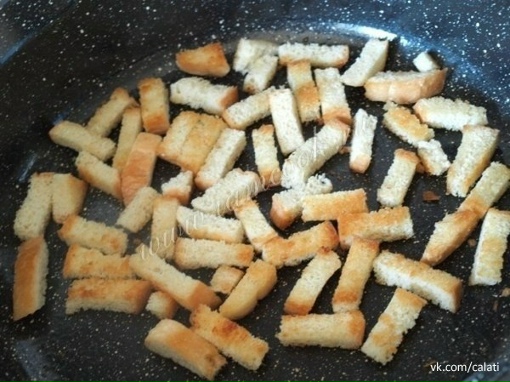 2. Влить в сковороду мало растительного масла и прожарить батон до румяной корочки. Выложить на кухонные бумажные полотенца для удаления излишнего масла.