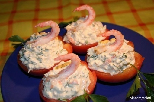 ИНГРИДИЕНТЫ: Помидорки, креветки, мягенький сыр, укроп, сметана либо майонез, горчица, соевый соус.